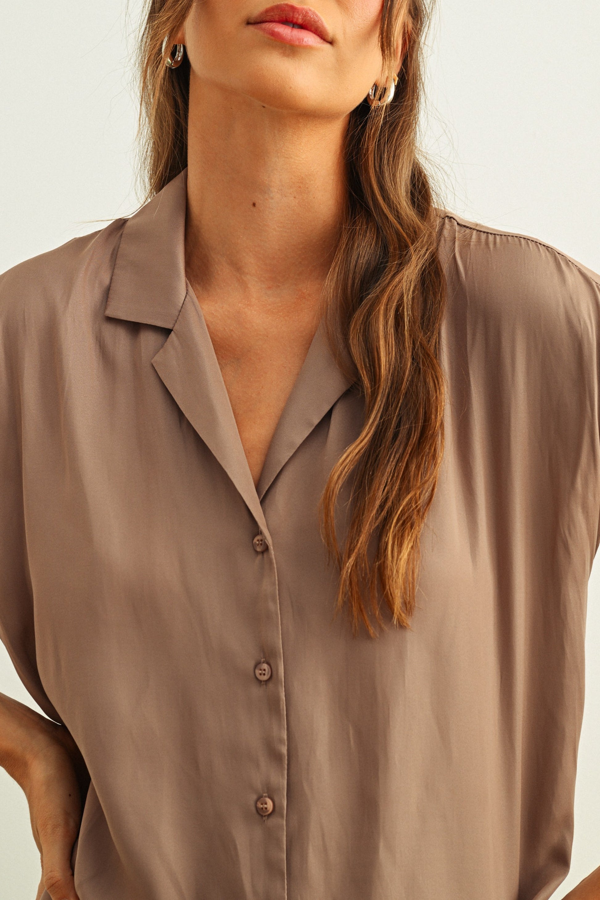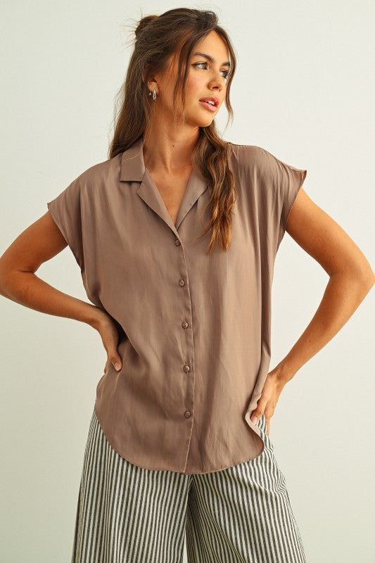 This sleeveless button-down top is the perfect blend of relaxed and refined. Designed with a lightweight, silky fabric that drapes beautifully, it features a subtle collar, full button front, and an easy, flattering fit that works tucked, half-tucked, or loose.