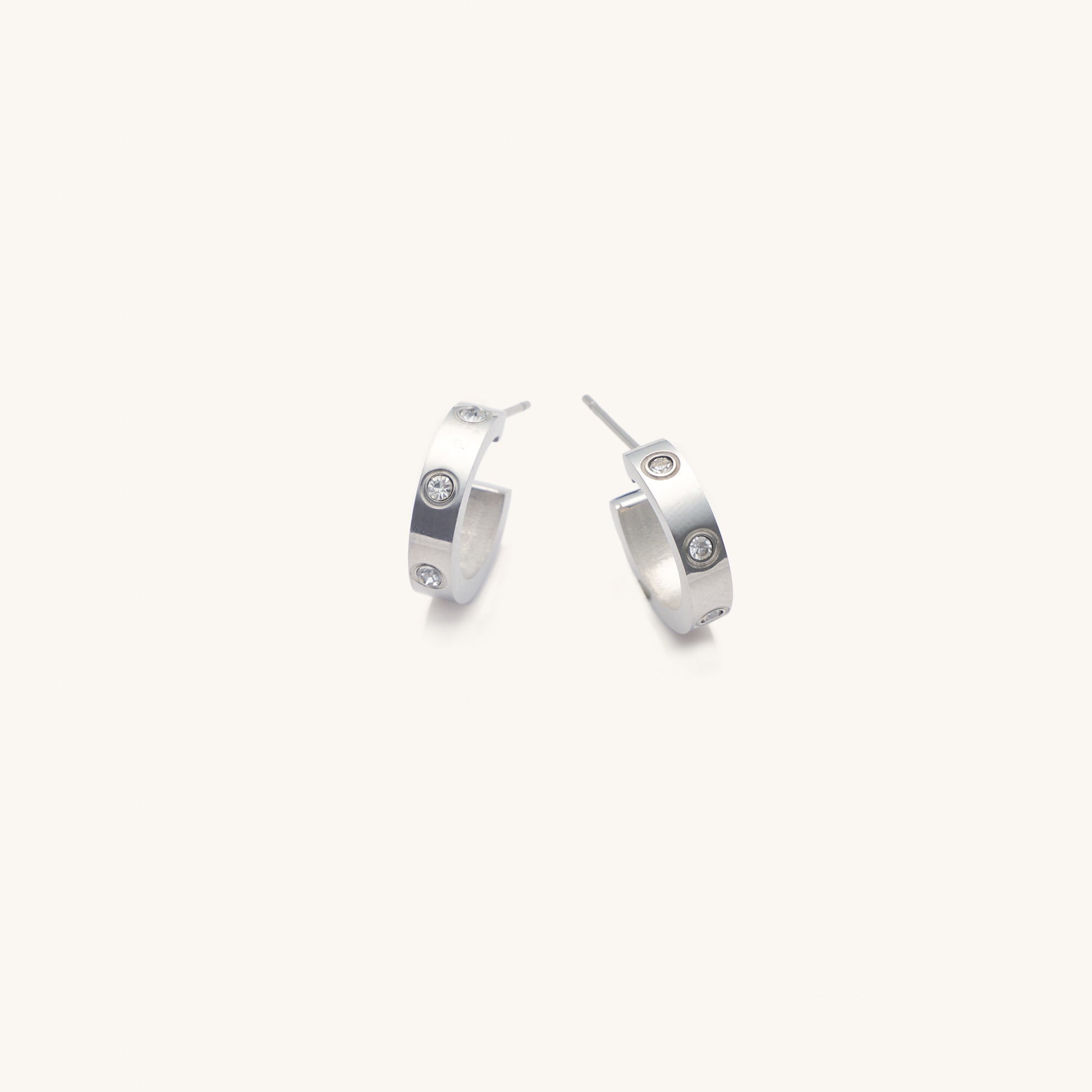 Material: Stainless steel with 14k Gold Plating Cubic zirconia gems spaced along each hoop Care: waterproof- feel free to wear these 24/7