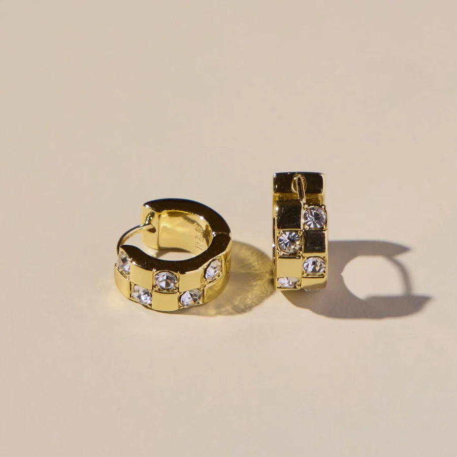 The Gold Pavé Checkered Huggies are a wide, small gold hoop with bezeled CZ stones that fits closely to the ear. They feature a hinge closure for comfort and wearabilit