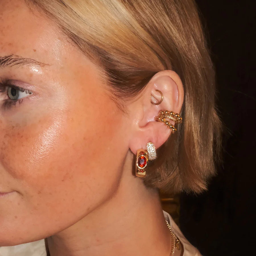 A gleaming round three set stone and natural in shape, these Red Wide CZ Bezel Hoops. A statement hoop versatile for any look, day to night.