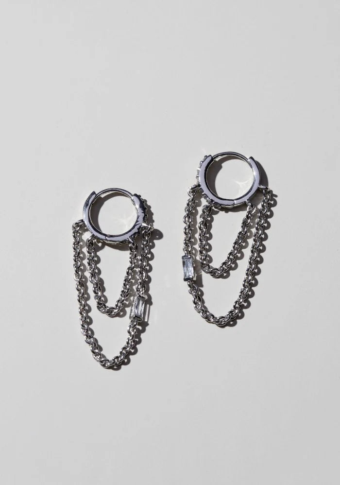 Amp up any ear stack with the Thea Chain Huggies. Stack them to make a bold layered statement or keep it simple and create a unique edge. These huggies are crafted with looped chains and an emerald cut glass stone accents. Let this timeless accessory speak volumes with your style.